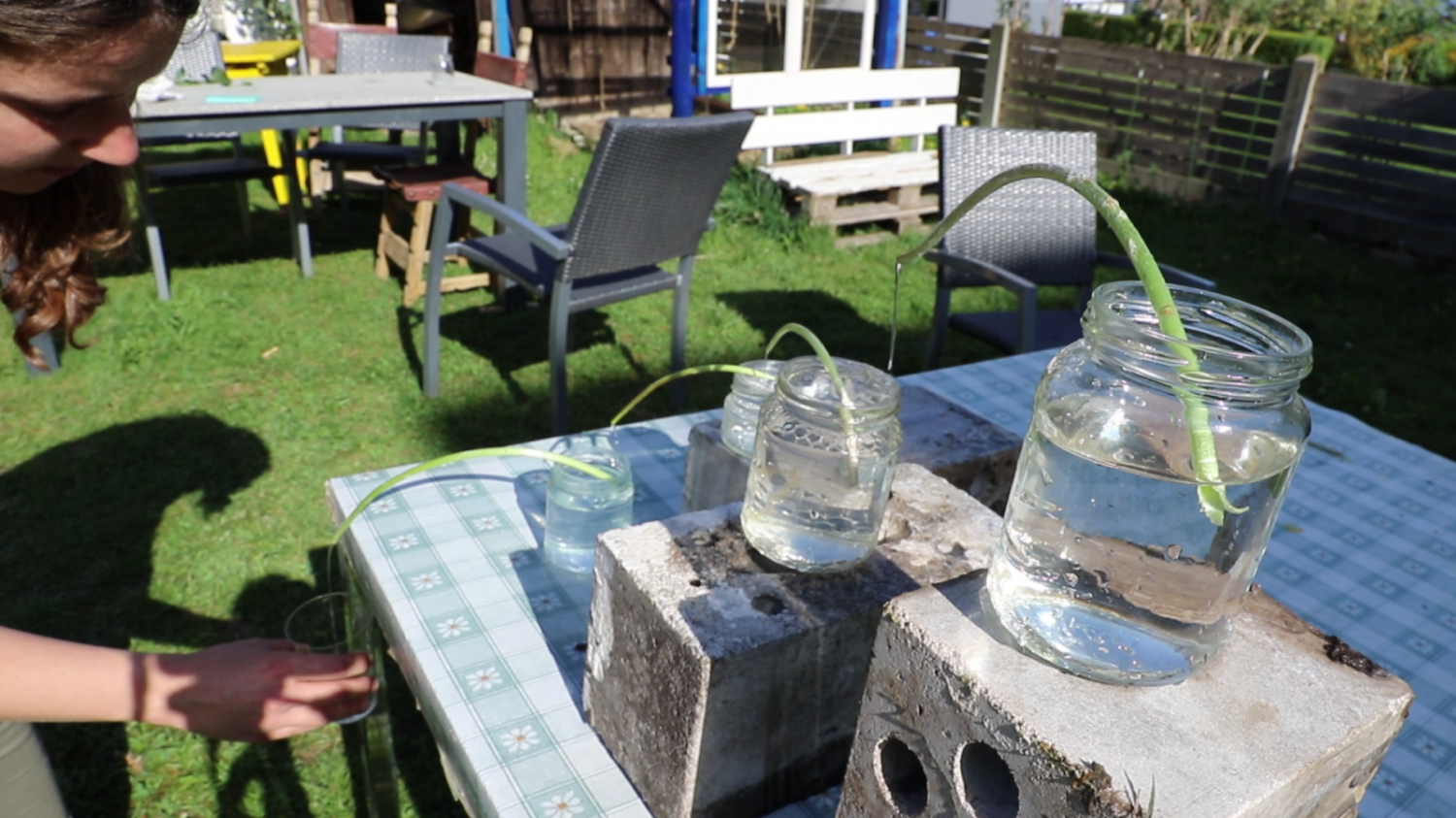 - Sauge das Wasser am anderen Stielende an und lass es fliessen.