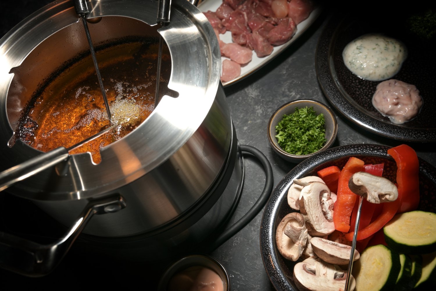 Did you know: Fondue Bourguignonne was invented in Switzerland! This means peak enjoyment in lively company with the finest Swiss meat, delicious sauces and tasty side dishes, of course à discretion. The "pure" option provides you with meat, sauces and side dishes. The "carefree" option complements the offer with drinks and a dessert.
